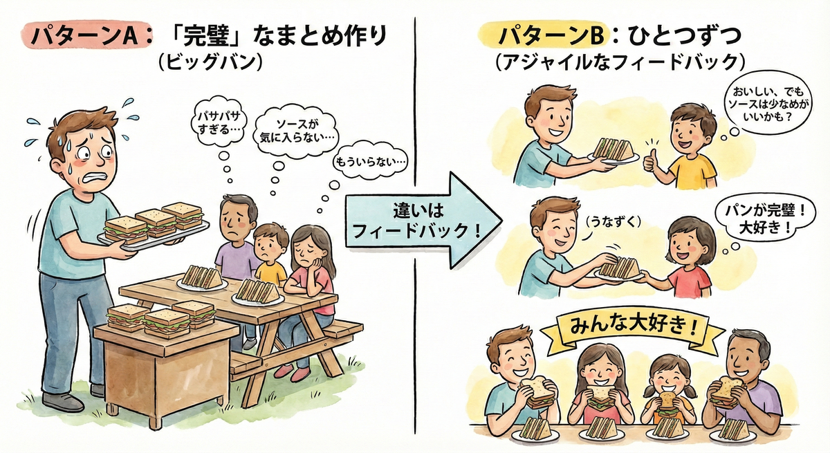 この「サンドイッチを1個ずつ作って試す」というアプローチこそ、アジャイル開発の本質です。