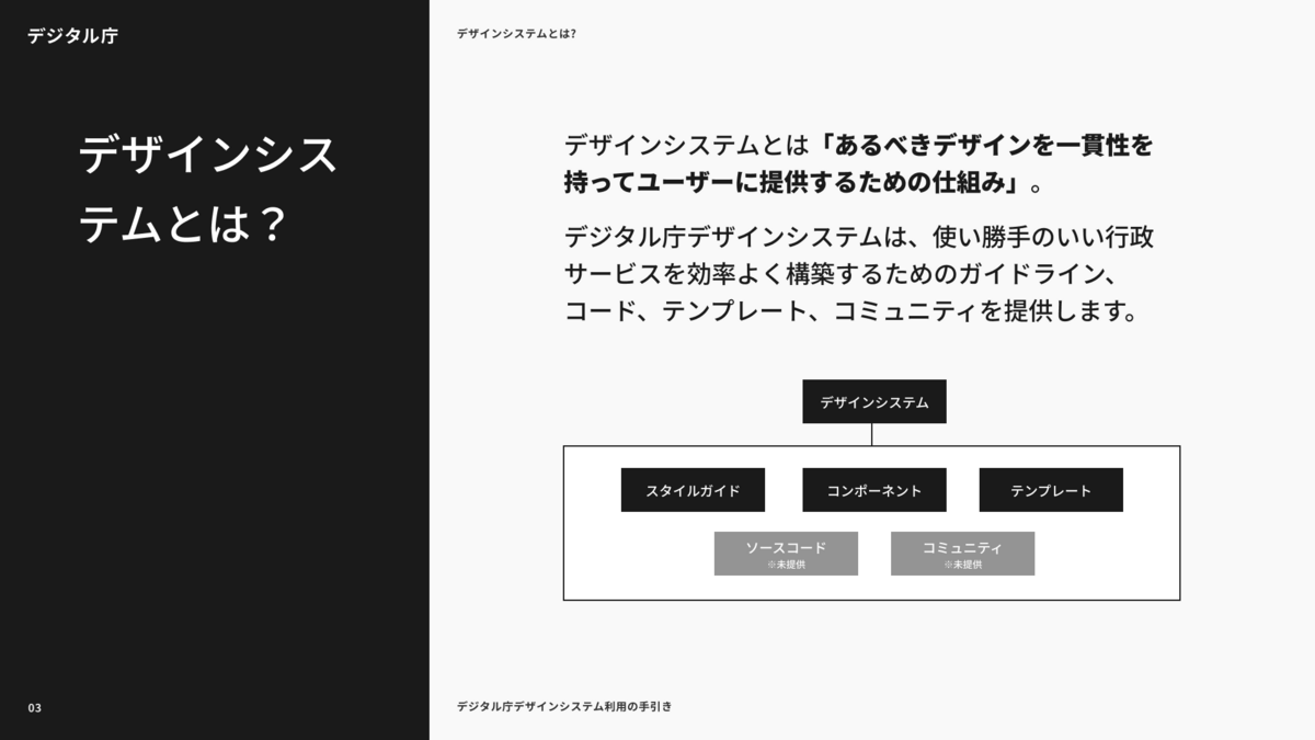 デザインシステムの定義については、デジタル庁の資料がとてもわかりやすいので、そちらを参照ください。